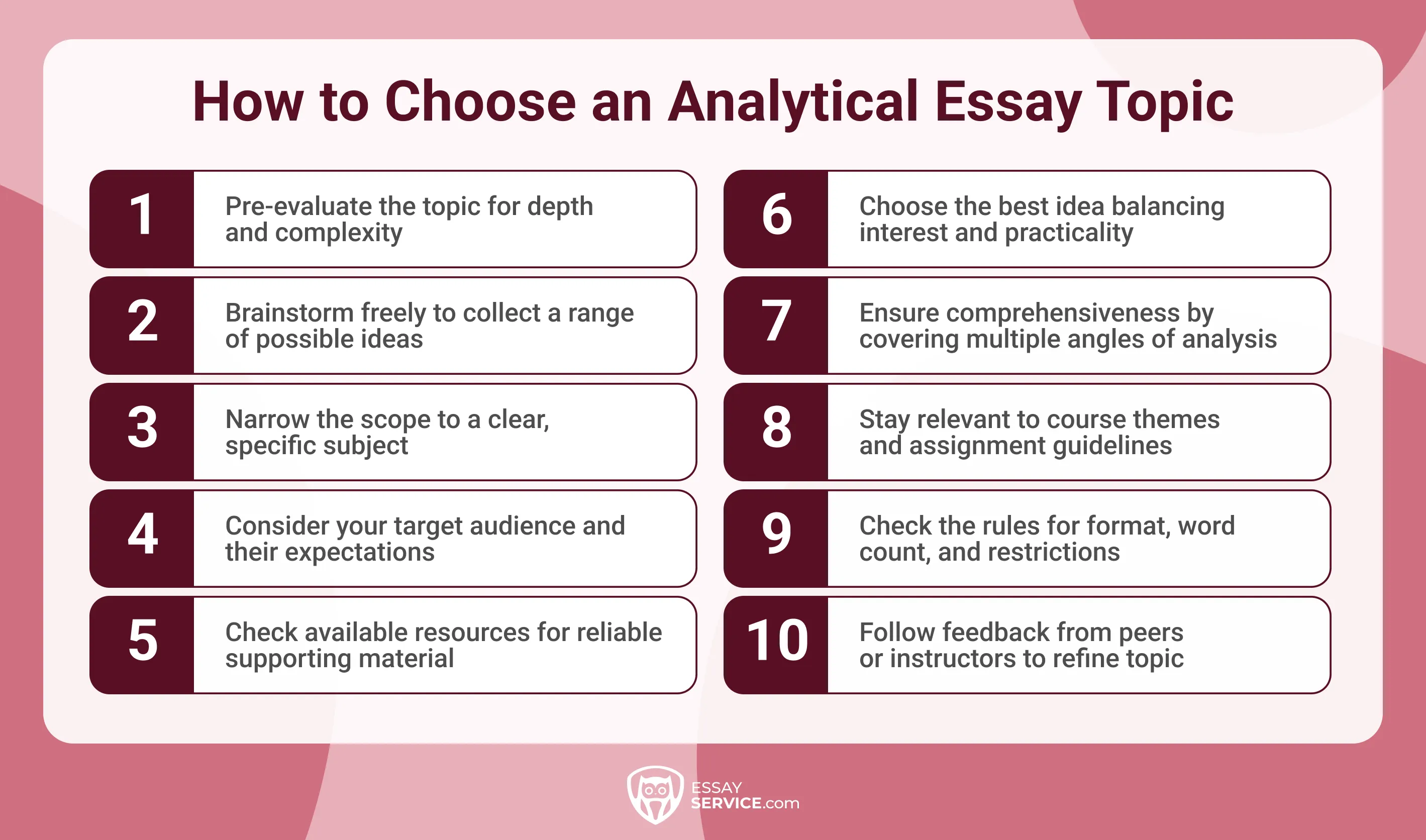 - Pre-evaluate the topic: Pick something that invites questions, not just summaries. Look at examples of analytical essay topics that leave space for interpretation and deeper meaning.