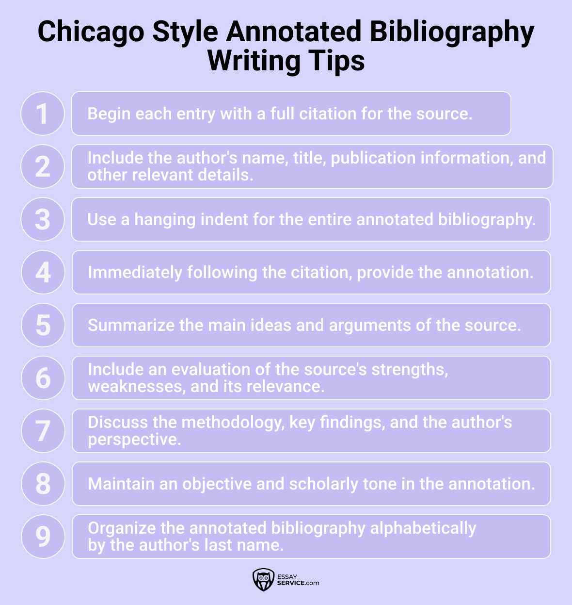 In the Chicago guidebook, an annotated bibliography follows a specific format. Here are the general guidelines for formatting an annotated bibliography in Turabian style, as it’s also known: