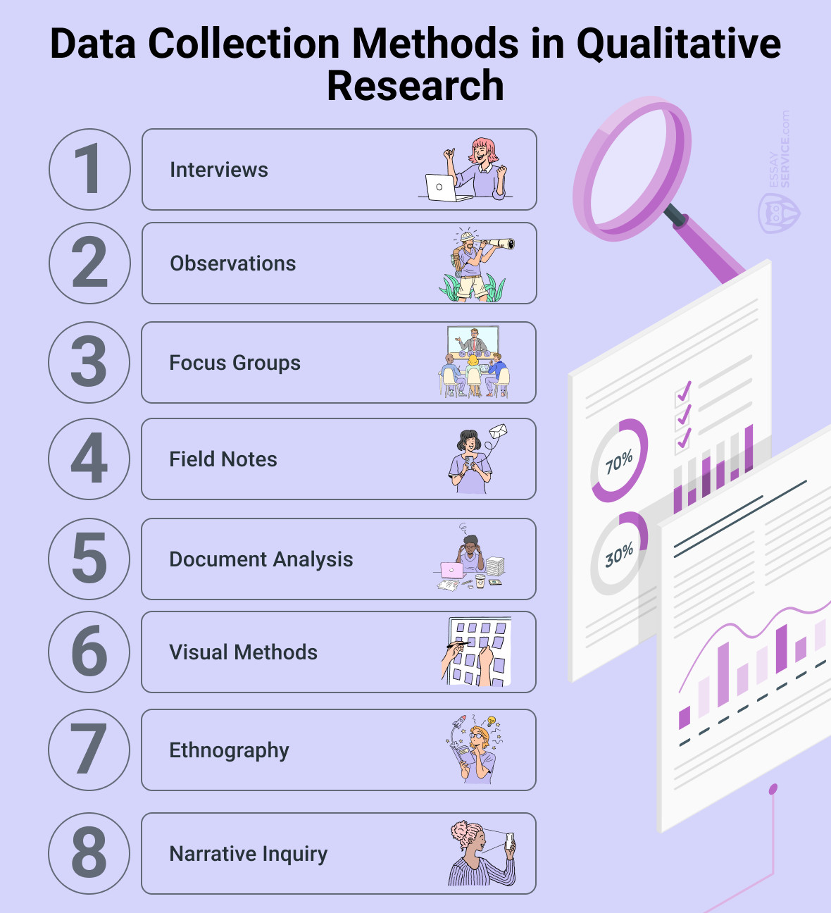 In qualitative research, data collection methods typically include interviews, observations, focus groups, and document analysis, allowing researchers to gather rich and detailed data on participants' experiences. We'll explain the quantitative observation meaning and go deeper in each method in the sections below.